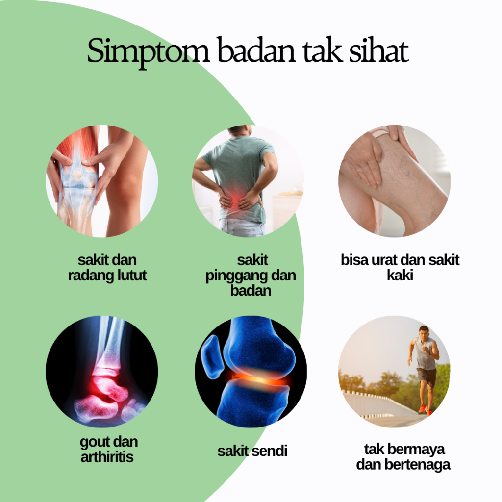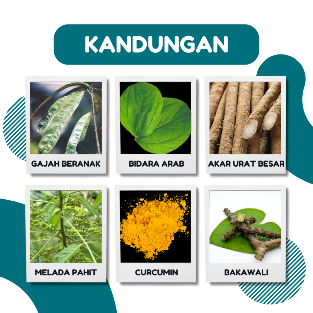 Diformulasi khas dengan ekstrak gajah beranak lebih kuat, bidara arab, akar urat besar, melada pahit, curcumin, dan bakawali untuk bantu kurangkan radang, legakan sakit lutut, bisa sendi, sakit uraf & saraf secara semulajadi.